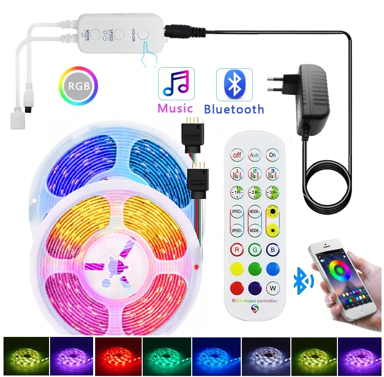 Speciální sada LED pásku s Bluetooth music ovladačem + klasickým IR dálkovým ovladačem umožnuje nastavení velkého množství světelných variací včetně světelných efektů reagujících na zvuk. Ovladač Bluetooth s podporou přístrojů se systémem iOS a Android.