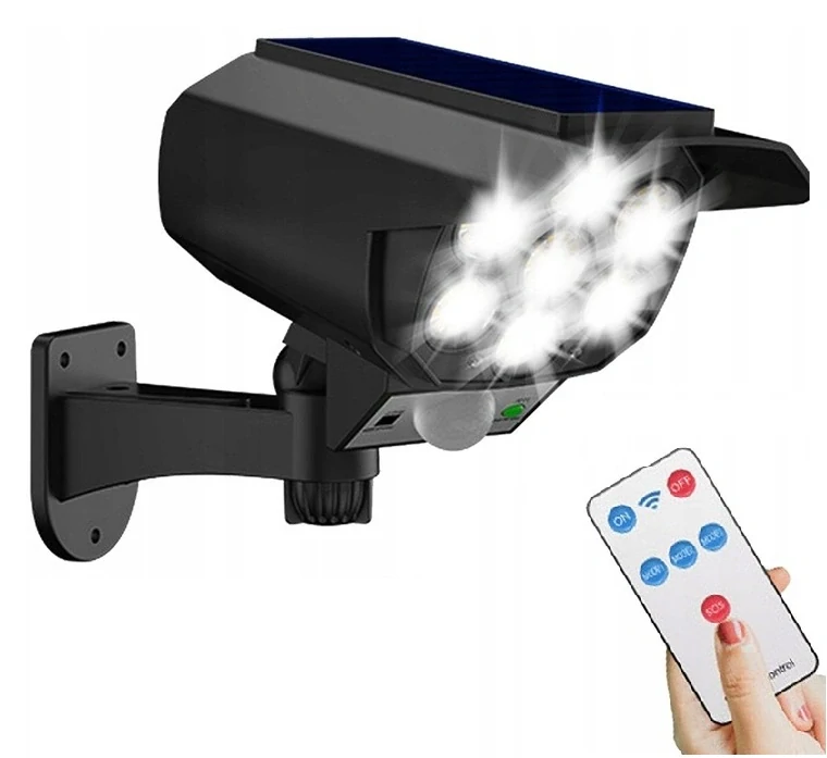 Solární atrapa bezpečnostní kamery s integrovaným detektorem pohybu, soumrakovým spínačem a solárním modulem. Dosah světla 5 metrů. Lze nastavit do polohy Vypnuto / Stalé svícení při setmění / PIR čidlo (svítí při zaznamenání pohybu dle nastavení). Světlo lze díky držáku lehce nastavit do požadované polohy.