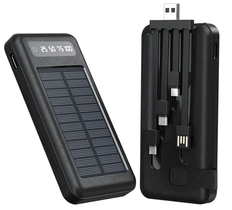 Univerzální solární nabíječka s vestavěnou baterií o kapacitě 20000mAh, USB a USB C konektorem + integrovaný/odnímatelný USB kabelem s 4 výstupy pro nabíjení, vhodná jako záložní zdroj pro mobily, GPS, MP3 a další elektroniku. Lze nabíjet pomocí solárního panelu, přiloženého USB konektoru přímo z PC nebo lze použít k nabití nabíječku mobilního telefonu.